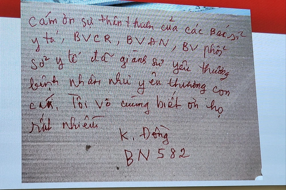 Những dòng chữ đầy xúc động của bệnh nhân 582 gửi tới đội ngũ y, bác sĩ đang làm nhiệm vụ tại Bệnh viện Phổi Đà Nẵng. Ảnh: T.AN