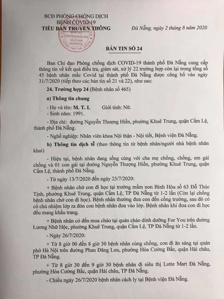 Chiều 2-8, Ban chỉ đạo Phòng chống dịch COVID-19 TP Đà Nẵng cung cấp thông tin về kết quả điều tra, giám sát, xử lý 22 trường hợp còn lại trong tổng số 45 bệnh nhân mắc COVID-19 tại TP được công bố vào ngày 31-7.