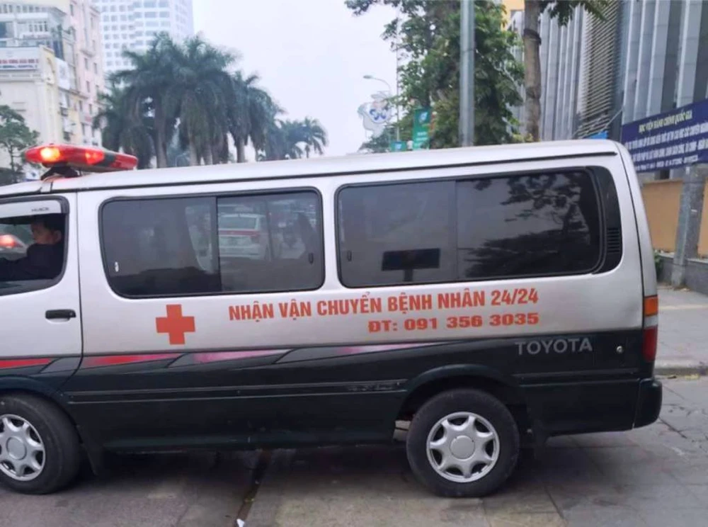 Chiếc xe được cho là chở thi thể nạn nhân rời khỏi Học viện Hành chính Quốc gia. Ảnh: Vietnamnet
