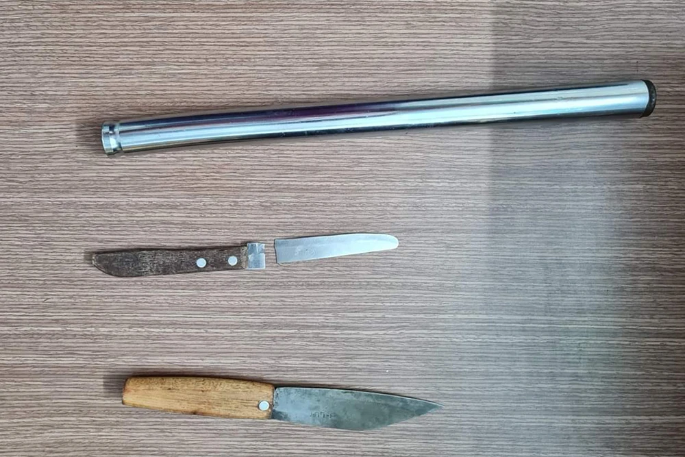 Con dao và gậy kim loại mà Đạt sử dụng để tấn công, chống đối lực lượng chức năng. Ảnh: HT