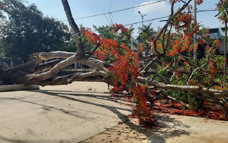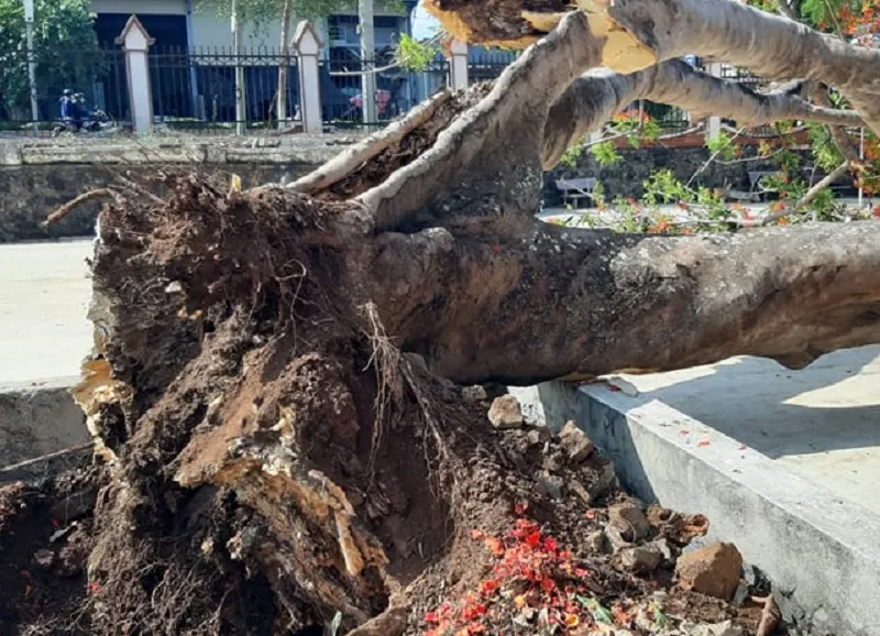 Vào thời điểm xảy ra sự việc cây phượng có đường kính khoảng 1m và cao khoảng 12m bị bật gốc , rất may không có học sinh đang ở sân trường.
