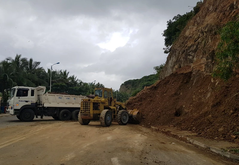 Quốc lộ 1 đoạn qua xã Vĩnh Lượng, TP Nha Trang bị hơn 1.000 m3 đất đá đổ tràn xuống mặt đường. Lực lượng chức năng tiến hành khắc phục, giao thông đã trở lại bình thường.