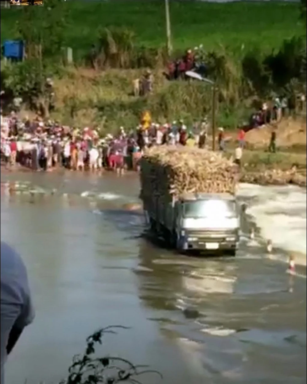 Ảnh chiếc xe tải chở mía bị mắc kẹt bởi dòng nước từ thủy điện An Khê-Ka Nak xả. Ảnh: LỮ QUỲNH LOAN