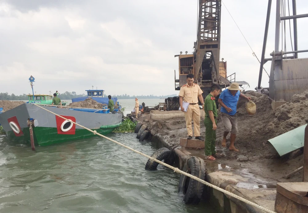 Trên đoạn sông giáp ranh giữa huyện Cái Bè, tỉnh Tiền Giang và huyện Long Hồ tỉnh Vĩnh Long, lực lượng chức năng đã phát hiện, bắt giữ 12 phương tiện có tải trọng từ 300 tấn đến 1.000 tấn và 32 người khai thác, vận chuyển cát trái phép.