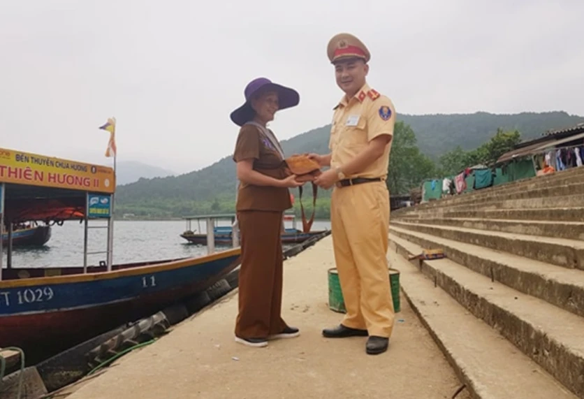 Sáng 3-3, Đại úy Nguyễn Tiến Bình (Đội tuần tra dẫn đường Phòng CSGT, Công an tỉnh Hà Tĩnh) đang làm nhiệm vụ bảo vệ tại bến tàu dẫn khách lên Khu di tích Chùa Hương (xã Thiên Lộc, huyện Can Lộc, Hà Tĩnh) nhặt được chiếc túi vải.