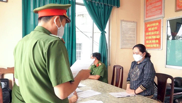 Công an đọc lệnh bắt tạm giam bị can Nguyễn Diễm My, nguyên Trưởng phòng DVKH kiêm Kế toán trưởng tại ngân hàng Phương Đông, chi nhánh Hòa An. Ảnh: CAHG