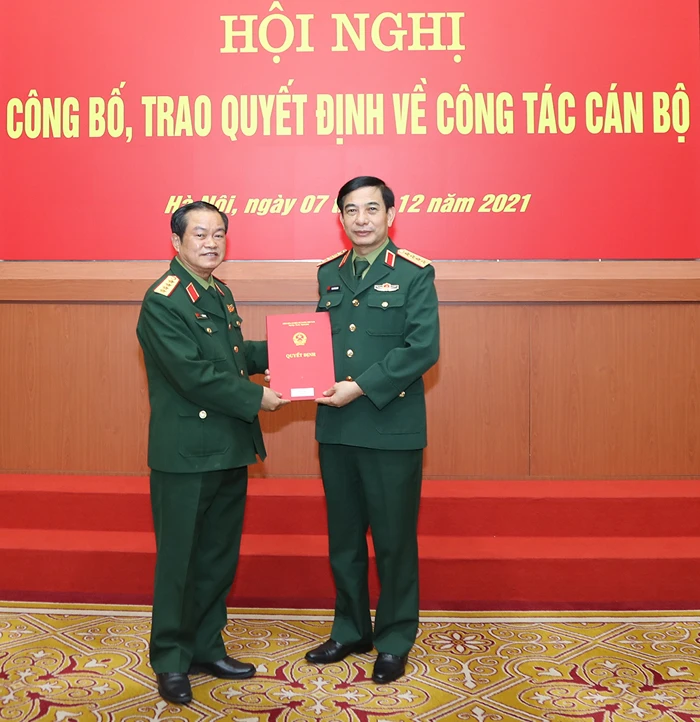 Đại tướng Phan Văn Giang trao Quyết định nghỉ hưu cho Thượng tướng Lê Chiêm. Ảnh: BQP