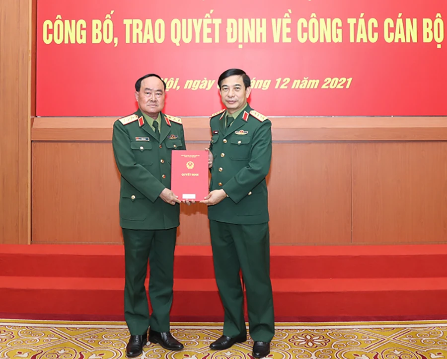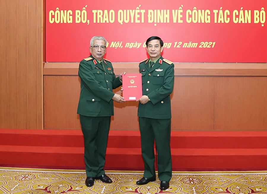 Đại tướng Phan Văn Giang trao Quyết định nghỉ hưu cho Thượng tướng Nguyễn Chí Vịnh. Ảnh: BQP