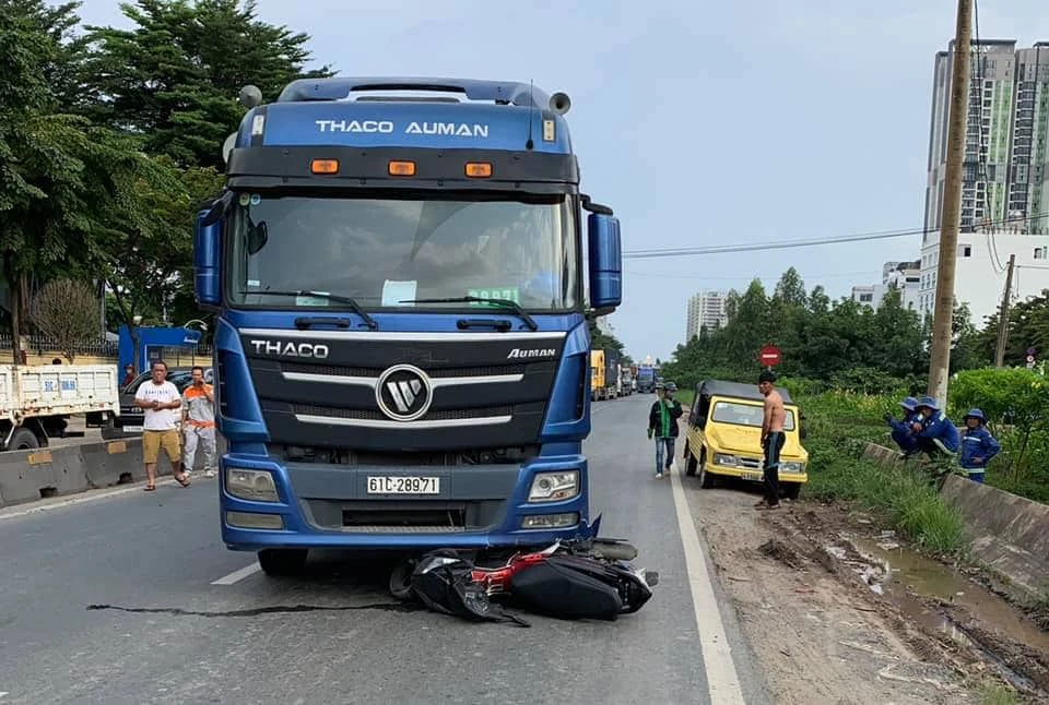 Đúng lúc này, một xe đầu kéo chạy từ phía sau không xử lý kịp đã cán qua.