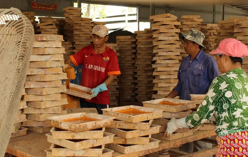 Công nhân Công ty 720 sản xuất gạch lát vỉa hè. Ảnh: NN