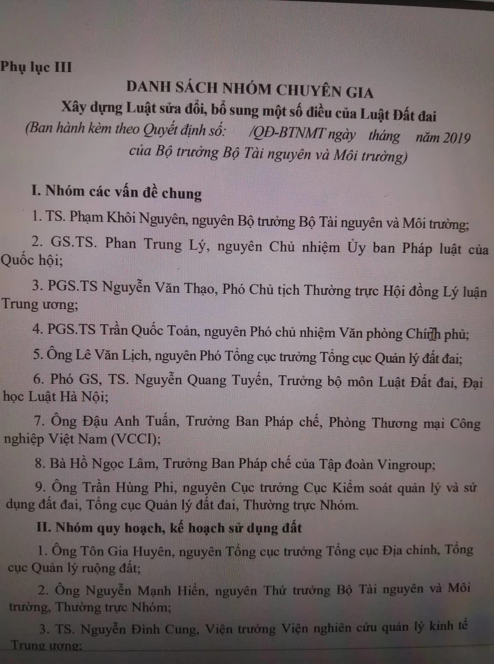 Tại phụ lục III, bên cạnh nhiều chuyên gia về đất đai đã và đang làm việc ở các bộ, ngành... có bà Hồ Ngọc Lâm, Trưởng Ban pháp chế của Tập đoàn Vingroup.