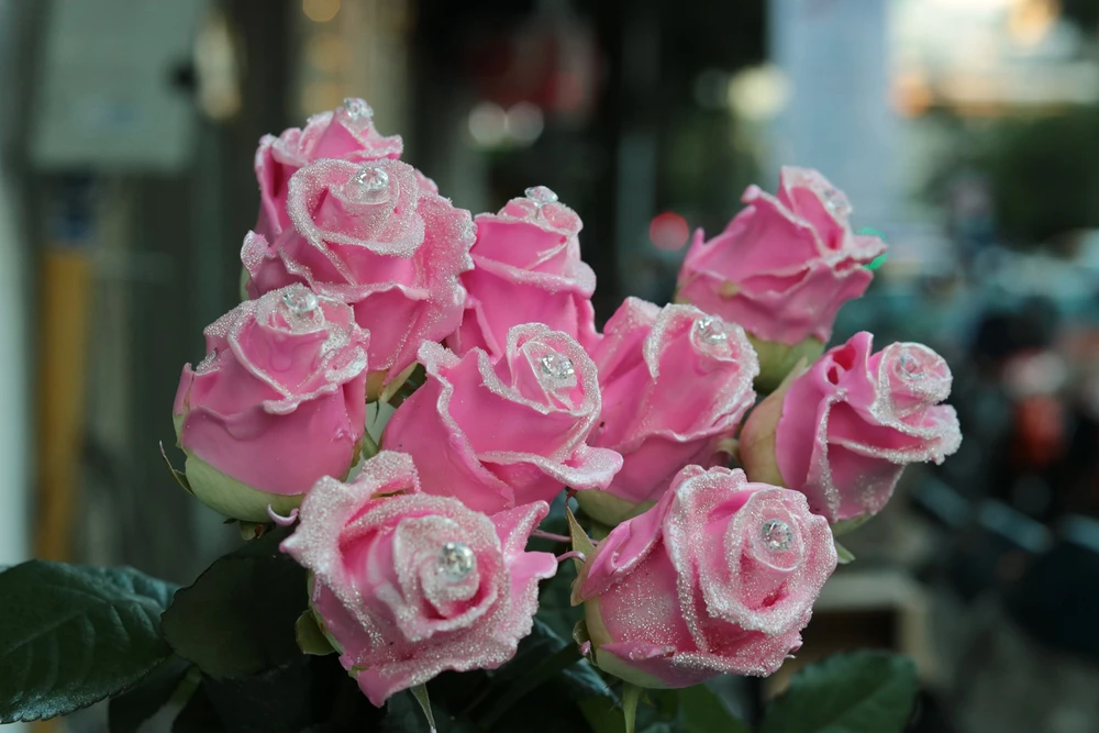 Ấn tượng hơn là hoa hồng phủ lớp socola màu hồng, trên bông này được đính một hạt pha lê rất độc đáo với tên gọi pink diamond rất hút khách. Giá hoa hồng tươi phủ socola 200.000-250.000 đồng/cành.