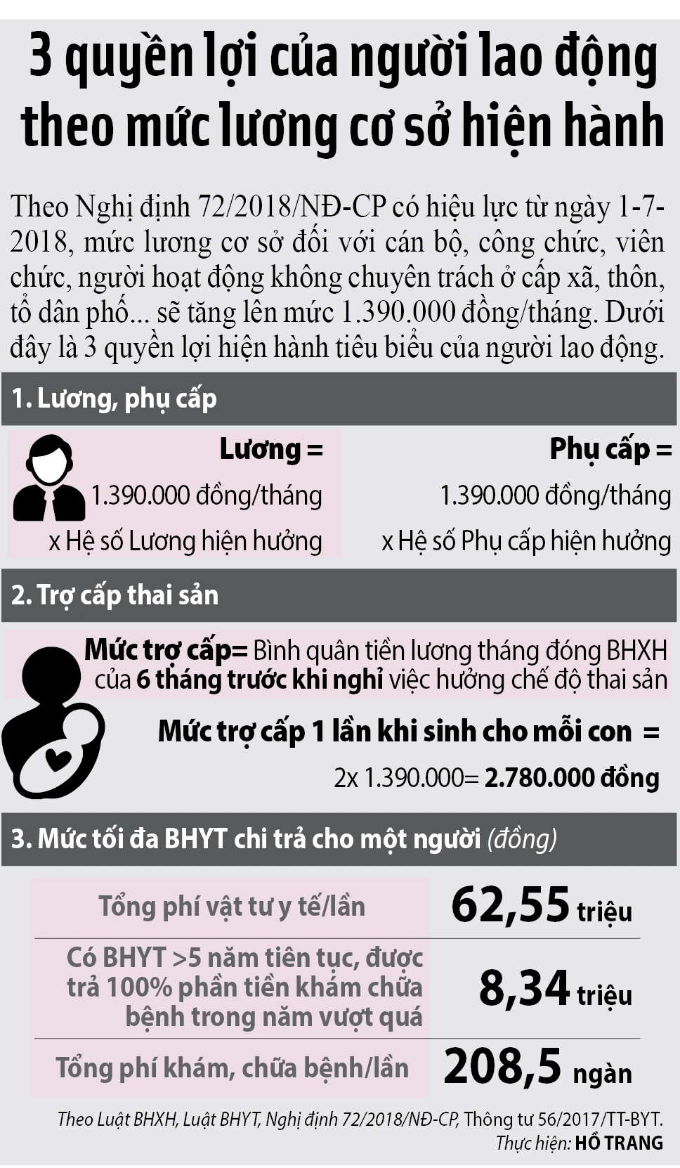 Mức trợ cấp một lần khi sinh con được áp dụng theo lương cơ sở, hiện nay mức lương cơ sở đang được áp dụng là 1.390.000 đồng (tương đương 1.390.000 x 2 = 2.780.000 đồng), tăng lên 180.000 đồng. Như vậy, trường hợp lao động nữ sinh con sau ngày 1-7-2018 sẽ có lợi hơn sinh con trước đó (2,6 triệu đồng).
