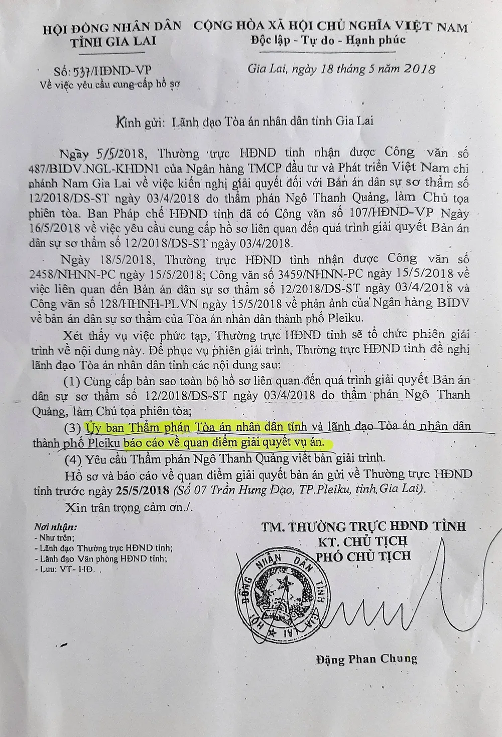 Sau công văn của ông Đặng Phan Chung ký, ngày 29-8-2018, TAND tỉnh Gia Lai đưa vụ án ra xét xử phúc thẩm và đã tuyên hủy toàn bộ bản án sơ thẩm của TAND TP Pleiku, chuyển hồ sơ vụ án cho TAND TP Pleiku giải quyết lại theo thủ tục sơ thẩm.