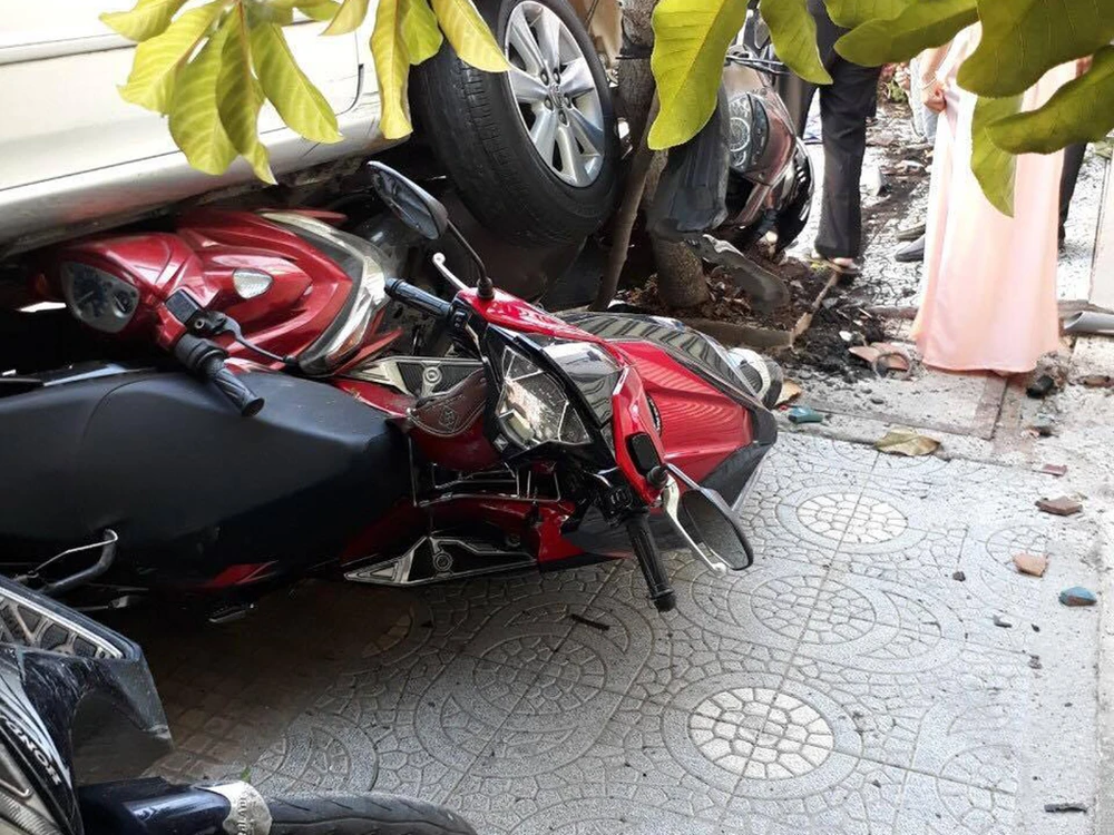 Trong khi lùi, xe đột ngột rú lên và lao qua đường cuốn bốn chiếc xe máy của người uống cà phê quán đối diện vào gầm và chỉ dừng lại sau khi tông vào một gốc cây.