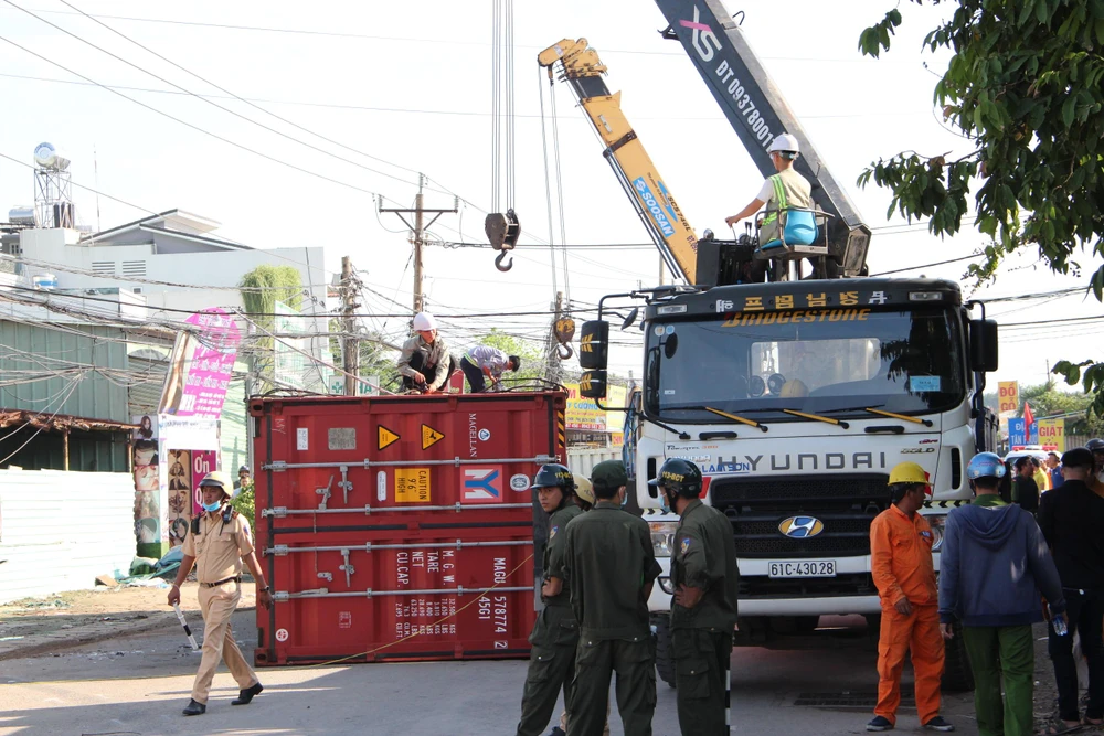 Lực lượng chức năng di dời thùng container khỏi hiện trường. Ảnh: KD
