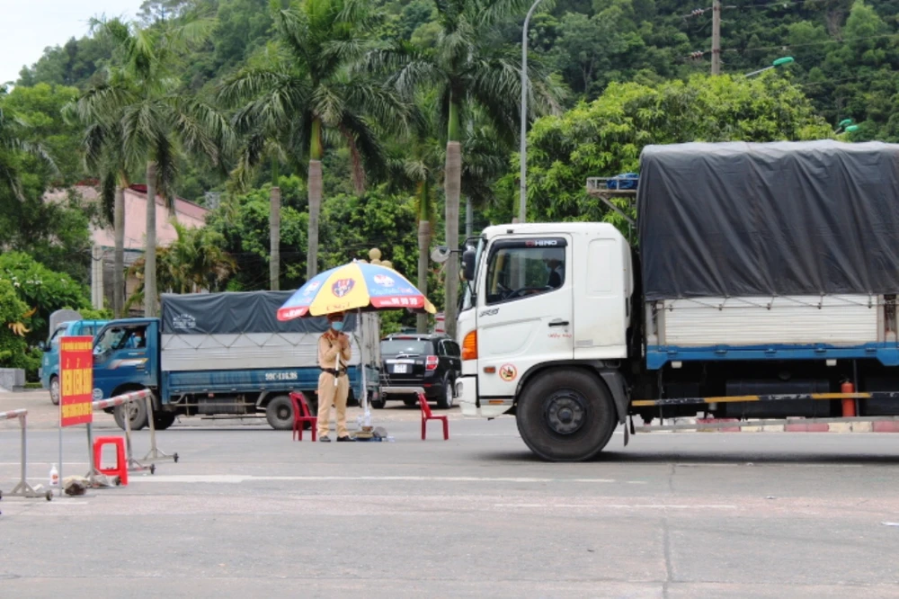 Điểm chốt trước trạm thu phí cầu Bến Thủy 1 (TP Vinh, Nghệ An) theo Chỉ thị 16.