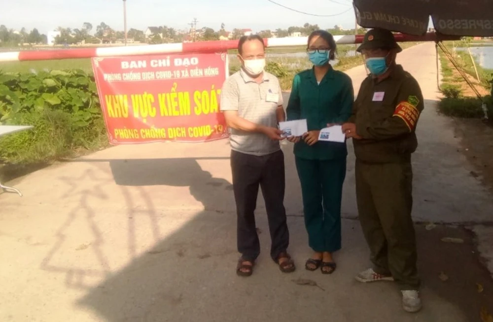 Người dân trao quà hỗ trợ lực lượng trực chốt phòng, chống dịch COVID-19 trên địa bàn xã Diễn Hồng.