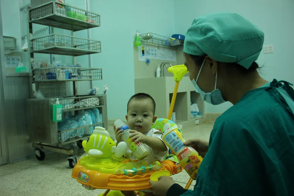 BS Phạm Ngọc Thạch chia sẻ: Sau phẫu thuật, bệnh viện có nguyên một êkíp chuẩn bị cho bé chế độ dinh dưỡng riêng hằng ngày và linh động thay đổi theo tuần. Em bé được cách ly trong môi trường tránh nhiễm khuẩn, được chăm sóc, vui chơi liên tục với các điều dưỡng 24/24 giờ. Mặc dù được xuất viện về nhà nhưng em bé vẫn phải tuân thủ và sinh hoạt theo tư vấn của bác sĩ, bé được chăm sóc trong phòng riêng, sạch sẽ, đảm bảo quy định tránh nhiễm khuẩn vì rất có thể làm cơ thể bé yếu đi.