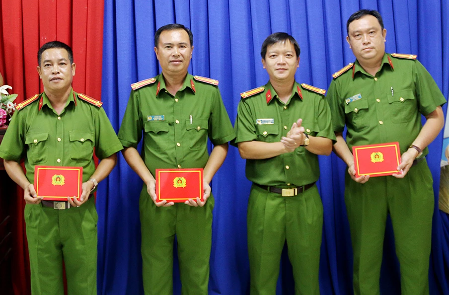 Trung tá Nguyễn Đức Hậu, Trưởng Công an TP Long Xuyên đã trao thưởng nóng cho các đơn vị. ảnh: CACC