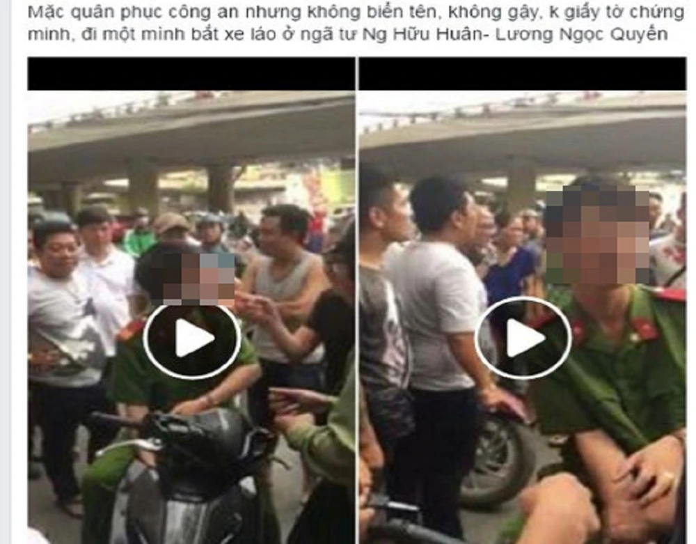 Chiều 13-8, mạng xã hội Facebook đăng tải hai đoạn clip ghi lại hình ảnh một thanh niên mặc quần áo công an nhưng không đeo bảng hiệu, ngồi trên một xe máy và cãi vã với người dân giữa đường.