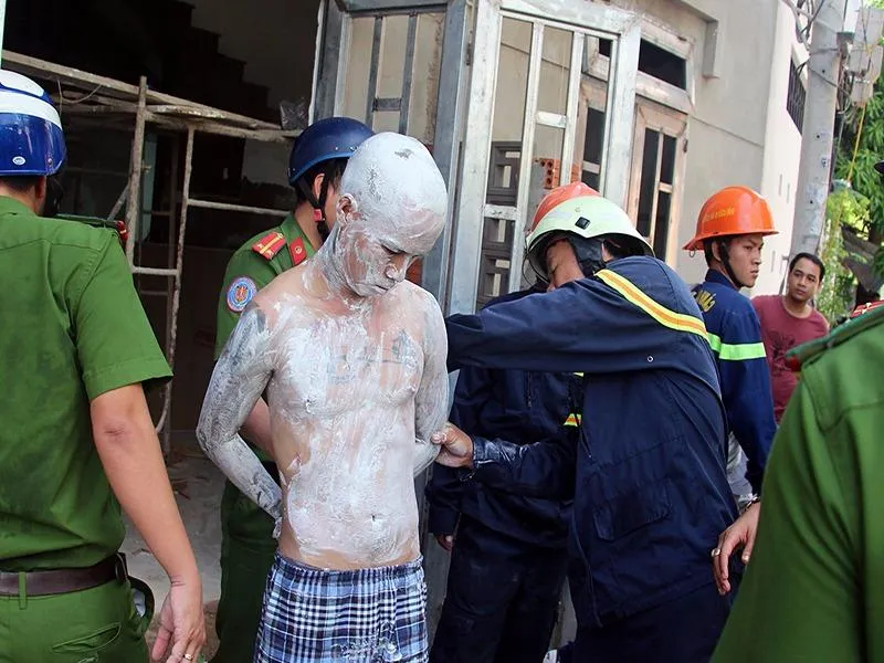 Nhận tin báo, Cảnh sát PCCC thành phố đã nhanh chóng tiếp cận. Nhưng khi thấy lực lượng chức năng, nam thanh niên đã tự đi xuống và nấp trong nhà vệ sinh ở tầng 1, toàn thân bôi vôi trắng và có biểu hiện như ngáo đá.