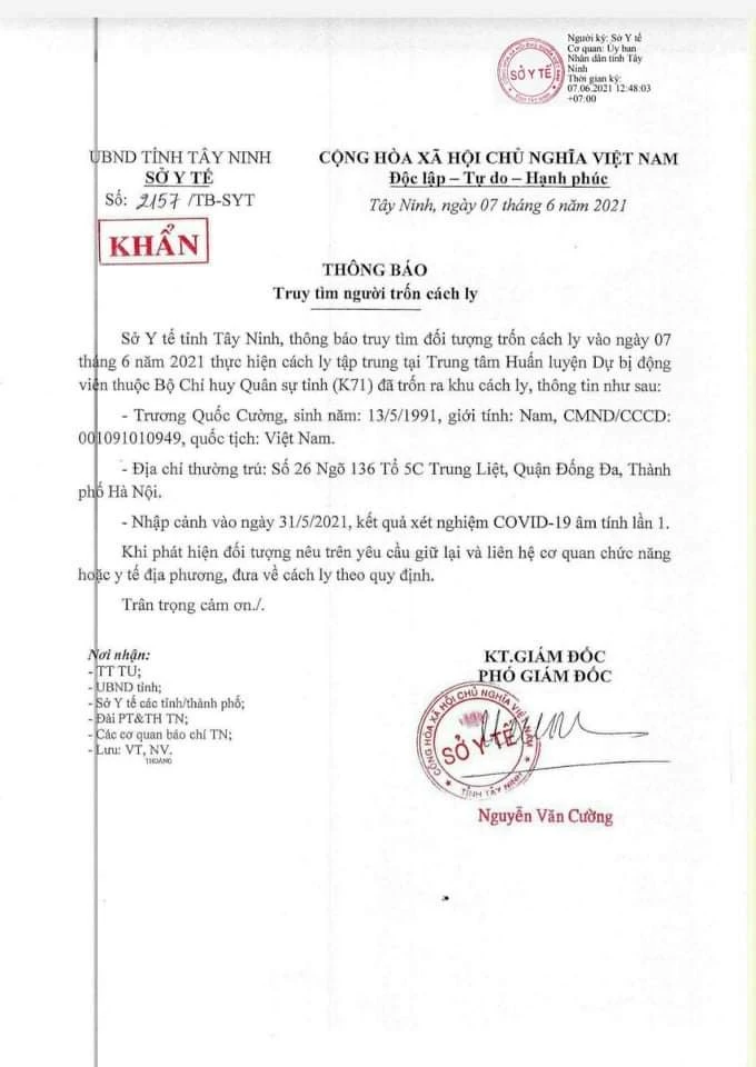 Ngày 7-6, Sở Y tế tỉnh Tây Ninh phát đi thông báo truy tìm Trương Văn Cường (sinh năm 1991, ngụ Hà Nội), nhập cảnh vào Việt Nam qua cửa khẩu ở Tây Ninh, đang thời gian cách ly tập trung thì bỏ trốn.