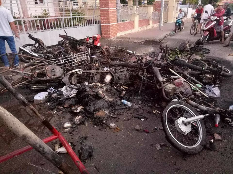 Những người tụ tập quá khích đốt xe trước trụ sở UBND tỉnh Bình Thuận.