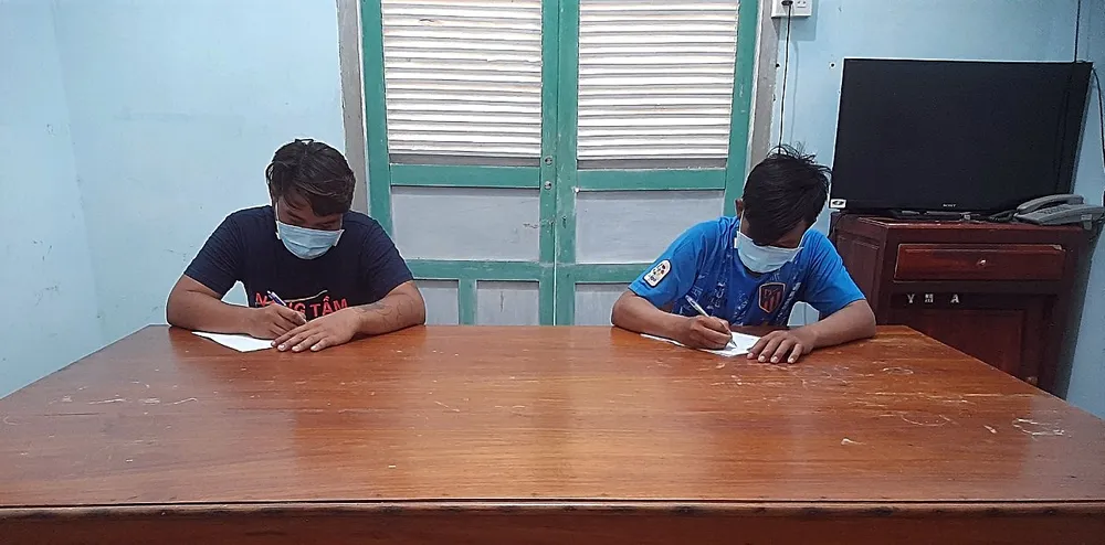 Anh Nguyễn Văn Thắng (áo xanh) và Tạ Ngọc Tân (áo đen) đang khai báo vụ việc. Ảnh BĐBP BT