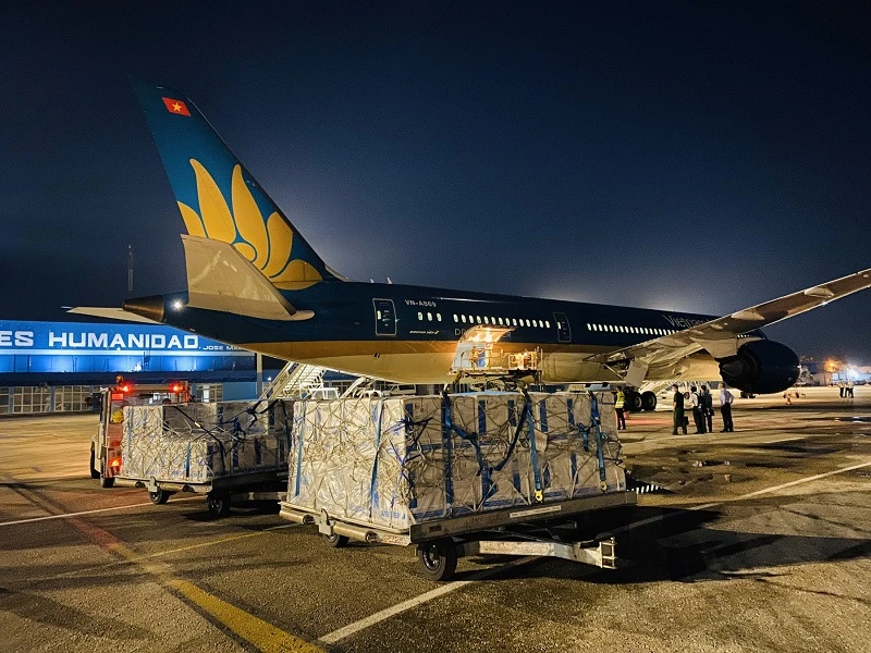 Máy bay của Vietnam Airlines tiếp nhận vaccine Abdala tại sân bay José Martí (La Habana, Cuba). Ảnh: VNA