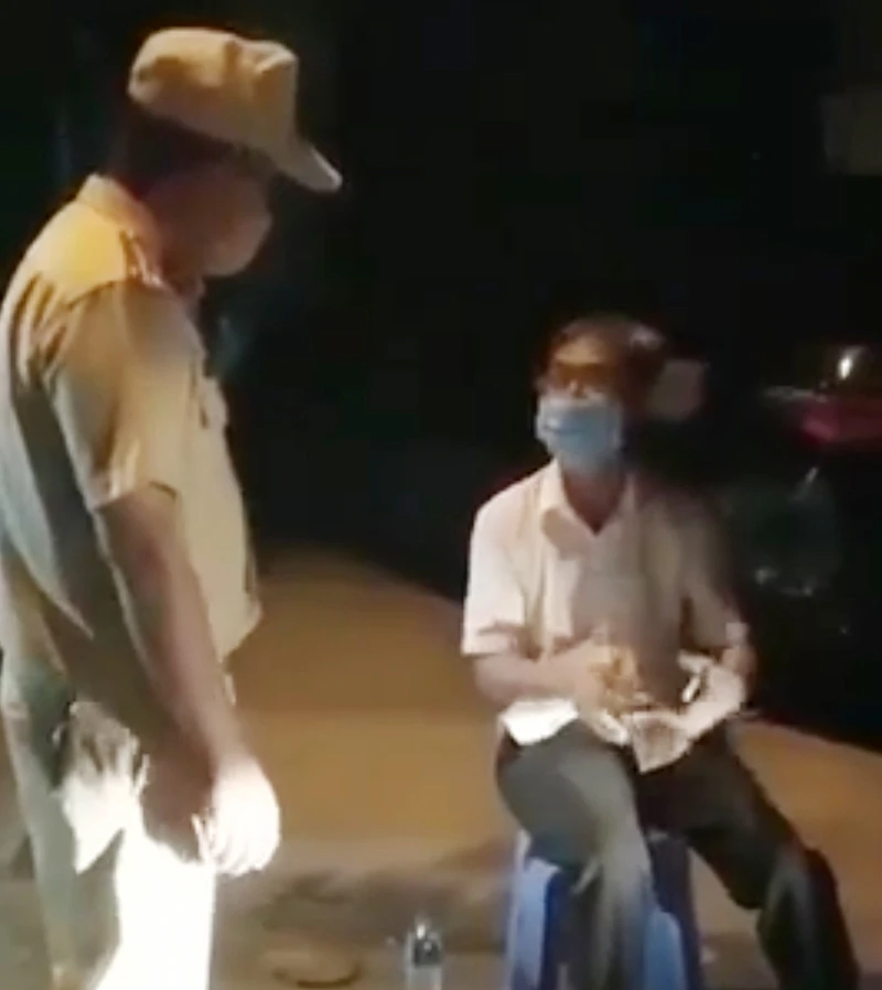 Trong clip ghi lại hình ảnh sự việc, một cán bộ công an làm việc, thông báo cho ông B. biết ông có một số vi phạm như điều khiển xe khi người có mùi rượu bia, lái xe vào đường cấm, ra đường vào khung giờ cấm nhưng không có giấy đi đường…