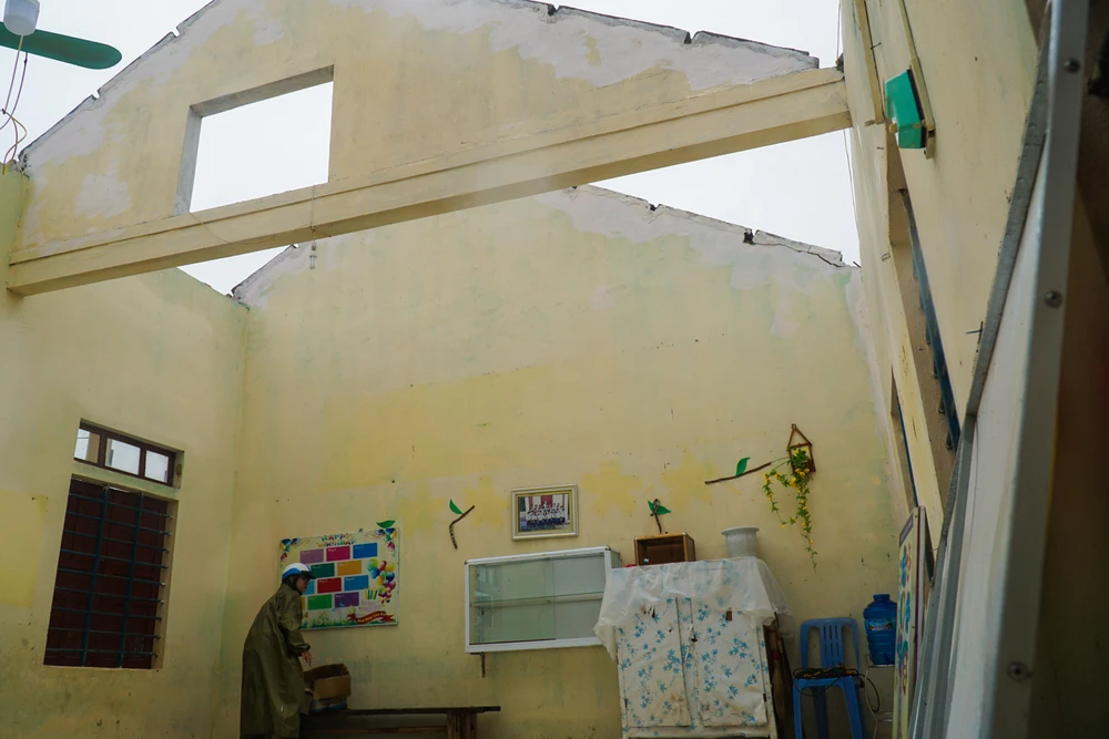 Cô Nguyễn Thị Lệ Hằng (hiệu trưởng nhà trường) cho biết khá bất ngờ khi sức gió tuy không mạnh như những đợt bão trước nhưng lại khiến các dãy phòng học tan hoang như thế này.