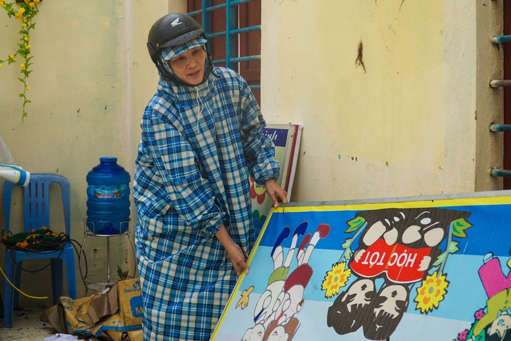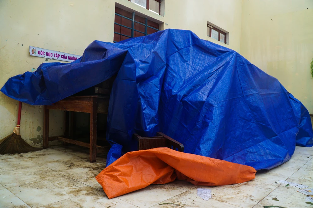 Thời điểm gió bão làm tốc mái, nhân viên bảo vệ tại trường đã kịp thời phủ bạt, bảo vệ một số cơ sở vật chất trong các lớp học như bàn ghế, sách vở...