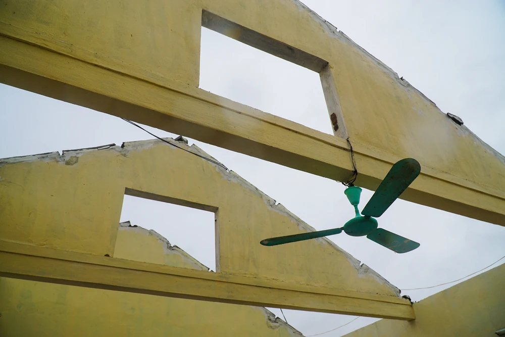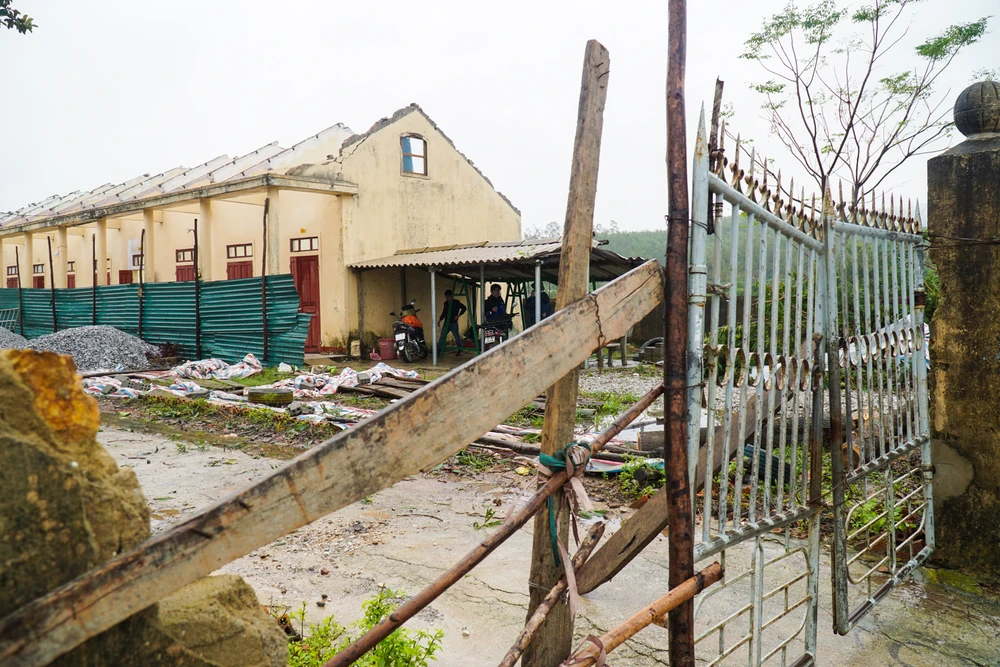 Phần cổng trường cũng bị cơn bão làm đổ sập, các giáo viên phải gia cố tạm thời bằng các ván gỗ, dây thép.