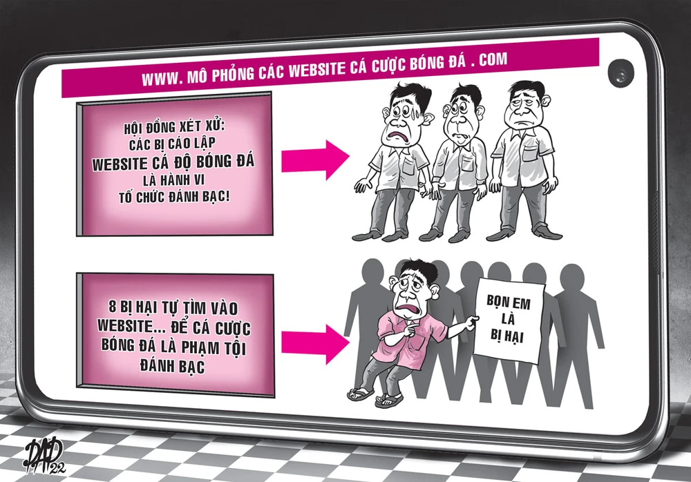 Tại phiên tòa, HĐXX xác định tám bị hại đã chủ động tìm vào các website có chức năng cá cược bóng đá để cá độ được thua bằng tiền nên dù là website thật hay giả mạo đều là hành vi đánh bạc bị pháp luật cấm.