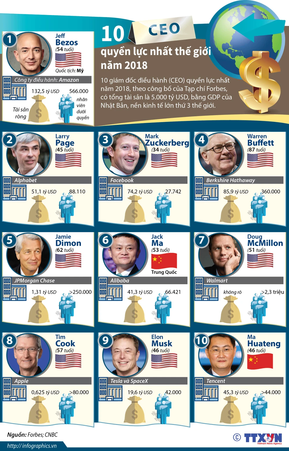 10 giám đốc điều hành (CEO) quyền lực nhất năm 2018, theo công bố của tạp chí Forbes, có tổng tài sản là 5.000 tỉ USD, bằng GDP của Nhật Bản, nền kinh tế lớn thứ ba thế giới.