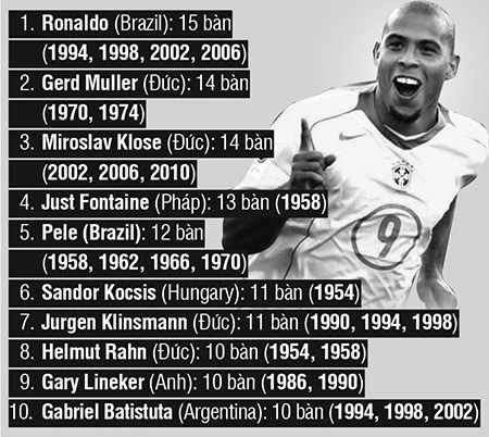 Vua bóng đá Pele cũng với bốn lần dự World Cup nhưng xếp thứ năm với 12 bàn. Trong số 10 chân sút này có Miroslav Klose là còn hy vọng phá được kỷ lục của Ronaldo vì anh là người duy nhất còn có thể xỏ giày ra sân tại World Cup 2014 này và đang sở hữu 14 bàn thắng.