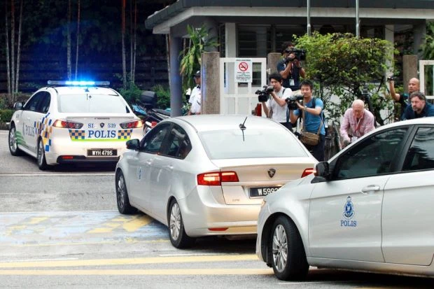 Xe chở hai nghi phạm được bốn xe cảnh sát hộ tống đi vào khuôn viên tòa án sáng 2-10. Ảnh: THE STAR