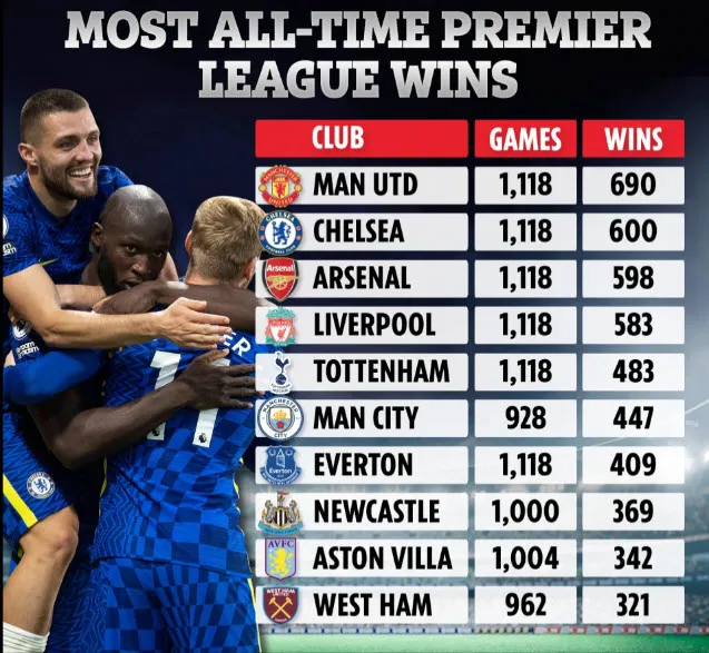 Những đội còn lại trong Top 10 lần lượt là Everton (409 trận thắng, 1.118 trận đấu), Newcastle United (369 trận thắng, 1.000 trận đấu), Aston Villa (342 trận thắng, 1.004 trận đấu), và West Ham United (321 trận thắng, 962 trận).