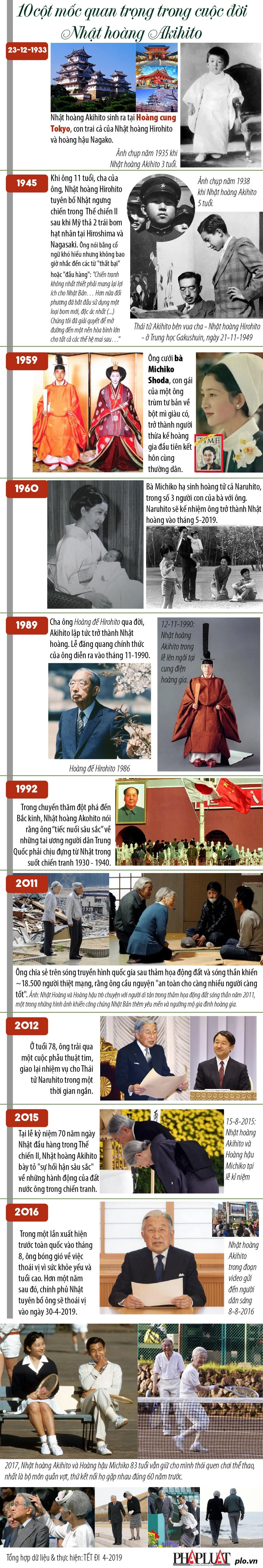 (PLO)- Từ 0h ngày 1-5-2019, ngày đầu tiên của triều đại Lệnh Hòa (Reiwa), Hoàng thái tử Naruhito trở thành hoàng đế, kết thúc triều đại Heisei của Thượng hoàng Akihito. Dưới đây là 10 sự kiện nổi bật trong cuộc đời vị Nhật hoàng được mệnh danh là "thiên hoàng phá lệ" này.