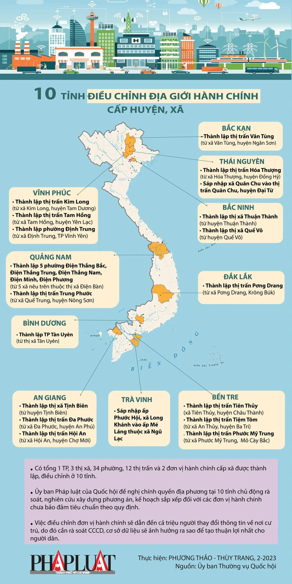 (PLO)- Tại Phiên họp thứ 20, Ủy ban Thường vụ Quốc hội đã thông qua các dự thảo nghị quyết về việc thành lập một số đơn vị hành chính cấp huyện, xã của 10 tỉnh gồm An Giang, Bắc Ninh, Bắc Kạn, Bến Tre, Bình Dương, Đắk Lắk, Quảng Nam, Thái Nguyên, Trà Vinh, Vĩnh Phúc.