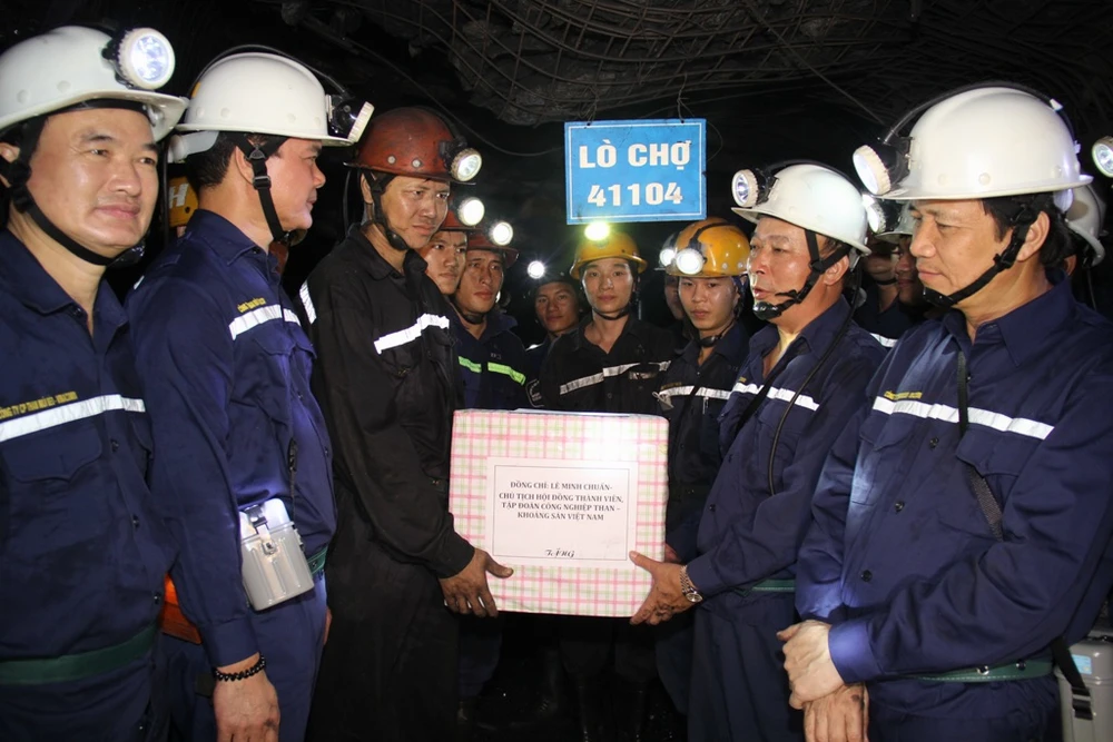 Ông Lê Minh Chuẩn (phải), Bí thư Đảng ủy, Chủ tịch HĐTV TKV thăm và tặng quà cho công nhân hầm lò.