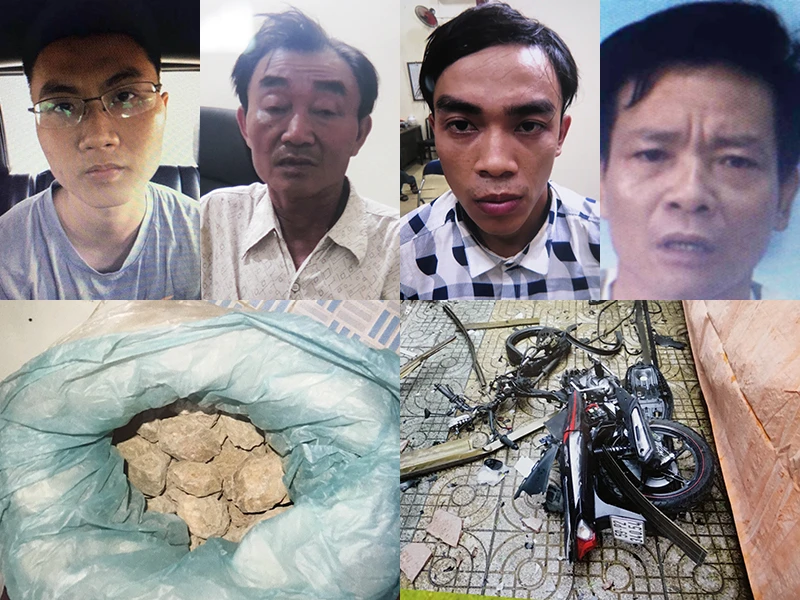 Bốn bị can bị khởi tố về tội khủng bố nhằm lật đổ chính quyền nhân dân gồm: Vũ Hoàng Nam, Nguyễn Khanh, Nguyễn Tấn Thành và Dương Bá Giang. Ảnh: NT. Các tang vật bị phát hiện và thu giữ. (Ảnh chụp lại từ tư liệu công an)