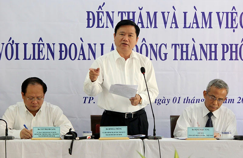 Uỷ viên Bộ chính trị, Bí thư Thành ủy Đinh La Thăng làm việc với Tổng Liên đoàn Lao động TP.HCM. Ảnh: HOÀNG GIANG