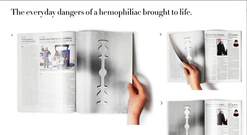 Ở mặt sau trang giấy đặc biệt này có chú thích: "Với những người mắc chứng máu khó đông, tờ giấy này cũng nguy hiểm giống như là dao vậy". - Quảng cáo của hội hỗ trợ người mắc chứng máu khó đông ở Thụy Sĩ đã có cách truyền tải thông điệp rất tinh tế.