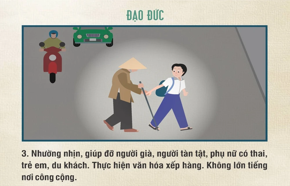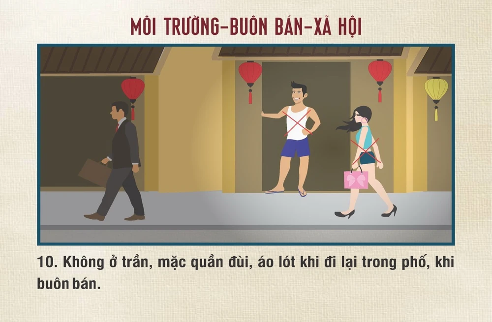 10 điều trong bộ quy tắc ứng xử này thuộc ba nhóm đạo đức, chấp hành luật giao thông, môi trường - buôn bán - xã hội. Trong đó đáng chú ý như người dân sống trên địa bàn khi gặp đám tang phải dừng xe, ngả mũ cúi chào; không xả rác và kêu gọi người xung quanh không xả rác; không ở trần, mặc quần đùi, áo lót khi đi lại trong phố và khi buôn bán; nhường nhịn người già, trẻ em, phụ nữ mang thai, du khách tham quan trên địa bàn TP...