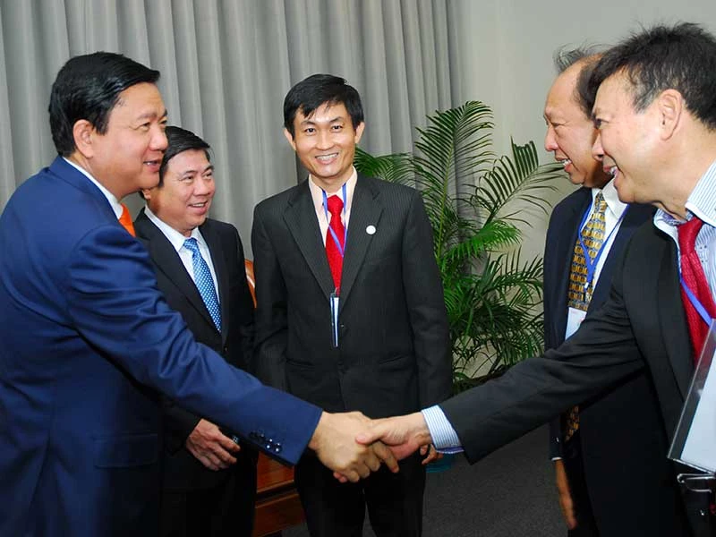 Bí thư Thành ủy TP.HCM Đinh La Thăng cùng Chủ tịch UBND TP.HCM Nguyễn Thành Phong (trái) trao đổi với kiều bào tại hội nghị kiều bào toàn thế giới 2016. Ảnh: HTD