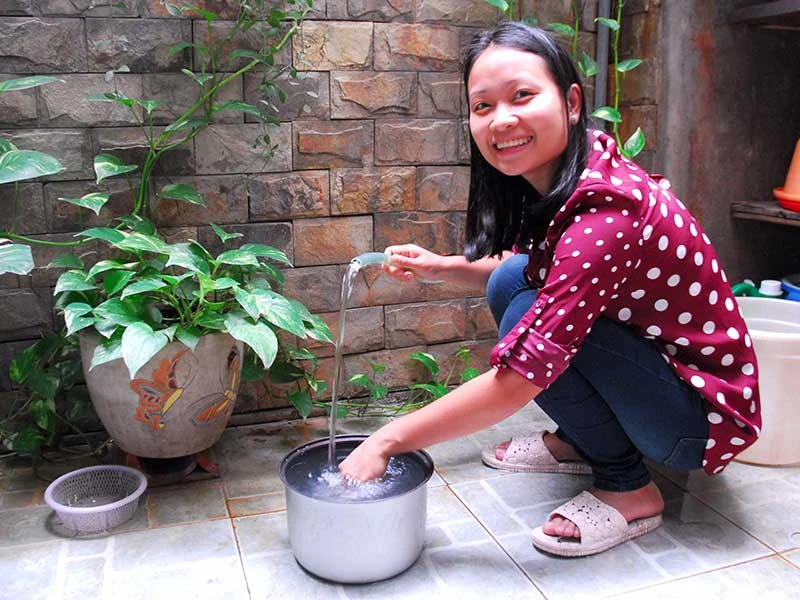 Chị Nguyễn Bích Trâm ở xã Bình Hưng, huyện Bình Chánh, TP.HCM vui mừng khi đón dòng nước sạch để sinh hoạt trong gia đình thay thế nước giếng nhiễm phèn. Ảnh: HTD