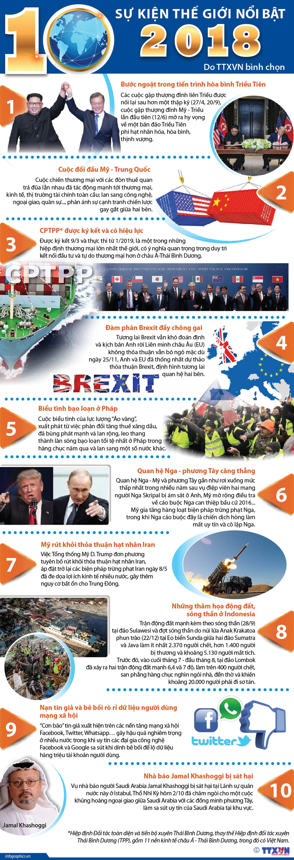 Thế giới 2018 khép lại với nhiều biến động: Cuộc đối đầu Mỹ - Trung Quốc, bước ngoặt trong tiến trình hòa bình Triều Tiên, CPTPP có hiệu lực, Đàm phán Brexit đầy chông gai, Biểu tình bạo loạn ở Pháp…