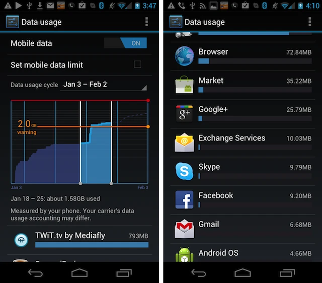 Giá cước 3G ngày càng cao khiến cho bạn phải đặc biệt chú ý đến lưu lượng 3G mà mình sử dụng. Để mọi thứ không vượt ngoài tầm kiểm soát, bạn cần theo dõi và giới hạn lưu lượng 3G mình sử dụng bằng cách vào Settings > Data Usage. Tại đây bạn có thể xem mình đã sử dụng bao nhiêu lưu lượng 3G trong một khoảng thời gian nhất định, xem ứng dụng nào tiêu hao nhiều lưu lượng nhất và thiết lập mức lưu lượng tối đa mà bạn sử dụng.